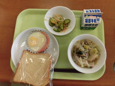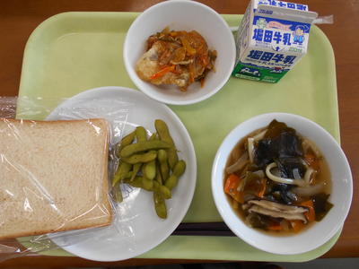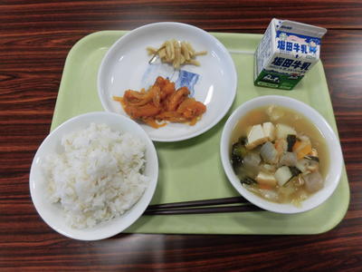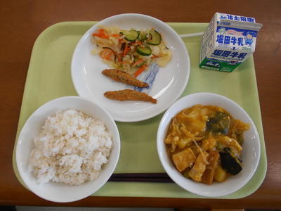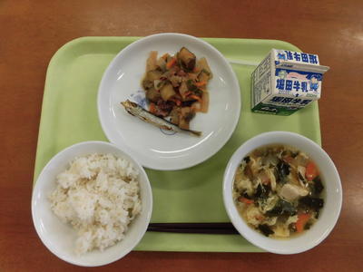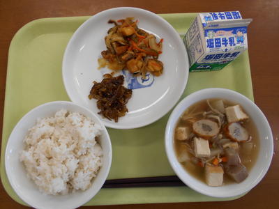 今日の給食は、麦ご飯、牛乳、ぶたあえ、かきたまじる、めざしでした。