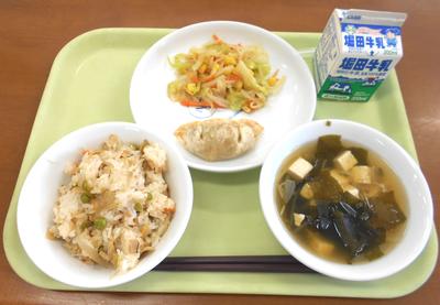 今日の給食は〈野菜おこわ,すまし汁,シモンドレッシングサラダ,ギョウザ〉でした。