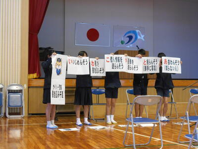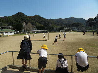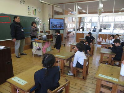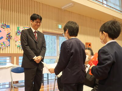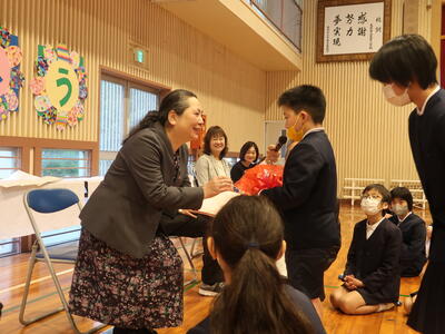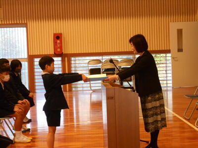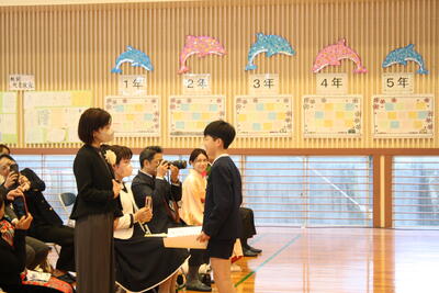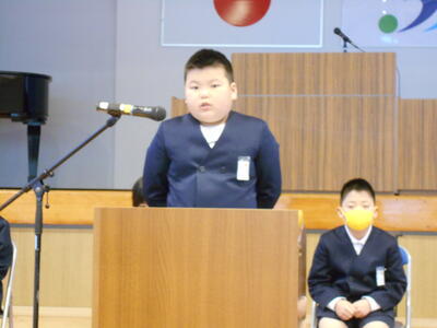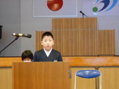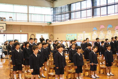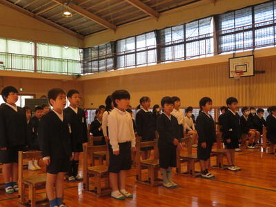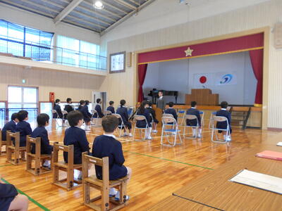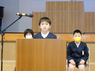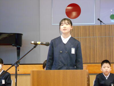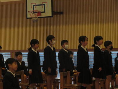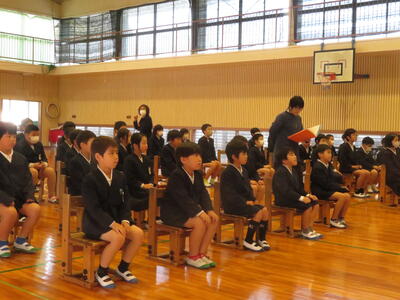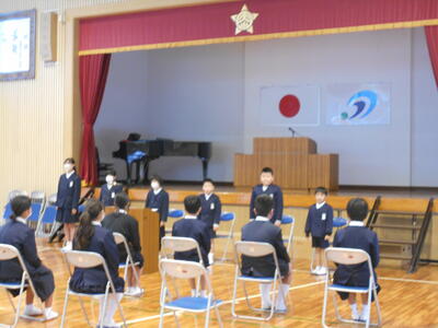 今日は修了式でした。一年間頑張ったことやこれから頑張りたいことをを各学年児童の代表が発表しました。それから校長の話があり、生活面、健康面の話をそれぞれの担当から話がありました。校長は、この一年間の頑張りを100点満点以上と評価し、中でも、一年生からみんなで運動会から研究発表会まで頑張れたこと、あいさつがよくなったことを褒めました。生活面ではSNS問題が大きくなっていることから、注意するポイントについて、生活面では朝、昼、夕、それぞれ一つずつ心がけて欲しいことについて話がありました。