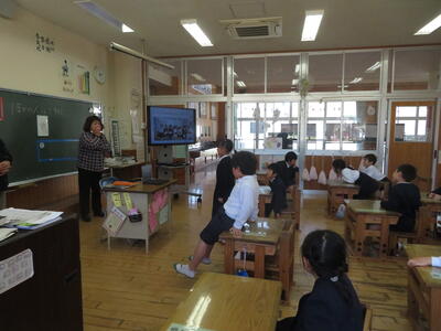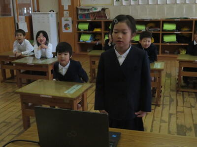(菊陽町立菊陽南小学校とのリモート交流会) 5時間目、1年生教室では菊陽南小学校1年生とリモートで交流会を行いました。写真は自己紹介をしている場面です。