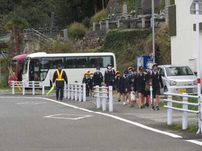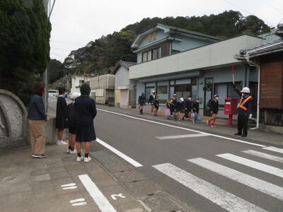 (登校の様子) 毎朝、元気にあいさつ運動を運営委員の児童が行っています。特に今年は、あいさつがめきめき上手になりました。交通指導員の尾下さん、深江さんも「元気が出る」と喜んでくださっています。いつも見守りそして交通指導ありがとうございます。