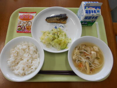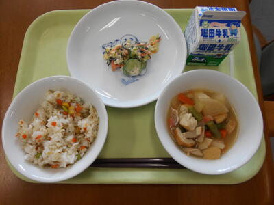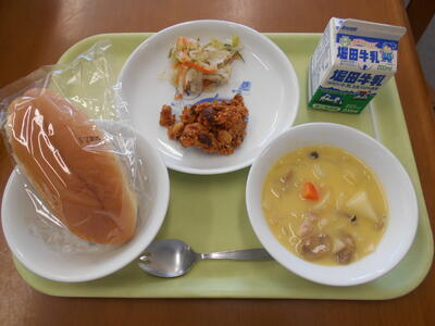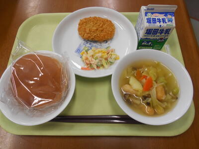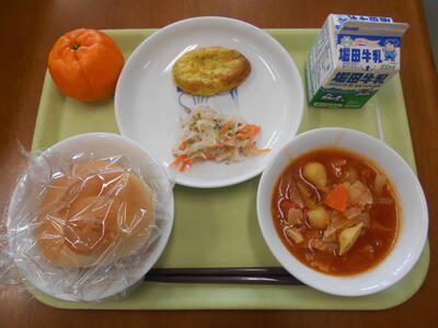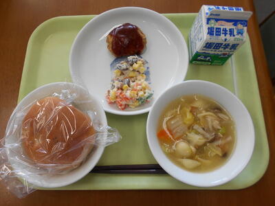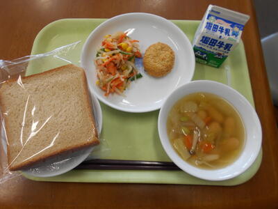 今日の献立は『黒糖パン、ウインナースープ、大豆とゴボウのミンチカツ、にんじんサラダ』でした。子供たちの大好きなウィンナースープは、当番がウィンナーを数えながら、みんなが平等に食べれるように気配りができていました。いつも新鮮な野菜のサラダは、給食の楽しみの一つです。今日も、にんじんサラダ美味しかったです。そして、何といっても給食センターの心のこもった手作りミンチカツ、ほのかなゴボウの香りが味を引き立てています。ひとつひとつ丁寧に作って頂きありがとうございます。