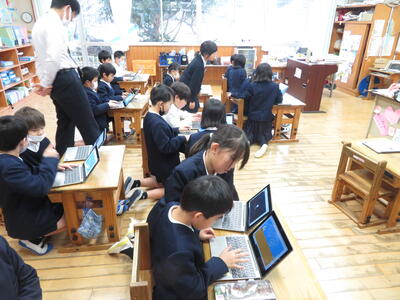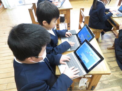学年を超えた合同授業の様子です。今日は1年生の教室で、4年生がタブレットの使い方を教えています。子供たちは活用能力が高くすぐに覚えて上手に使っています。