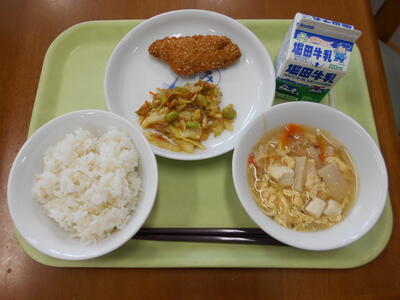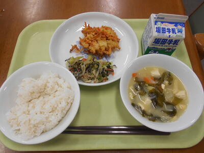今日の献立は、『麦ご飯、豆腐とワカメの味噌汁、さきイカとと野菜のかき揚げ、かつのりサラダ』でした。タマネギなど素材の味がしっかりと味わえるかき揚げ、たっぷり具が入った味噌汁、シャキシャキ野菜のサラダどれも美味しくご飯が進みました。