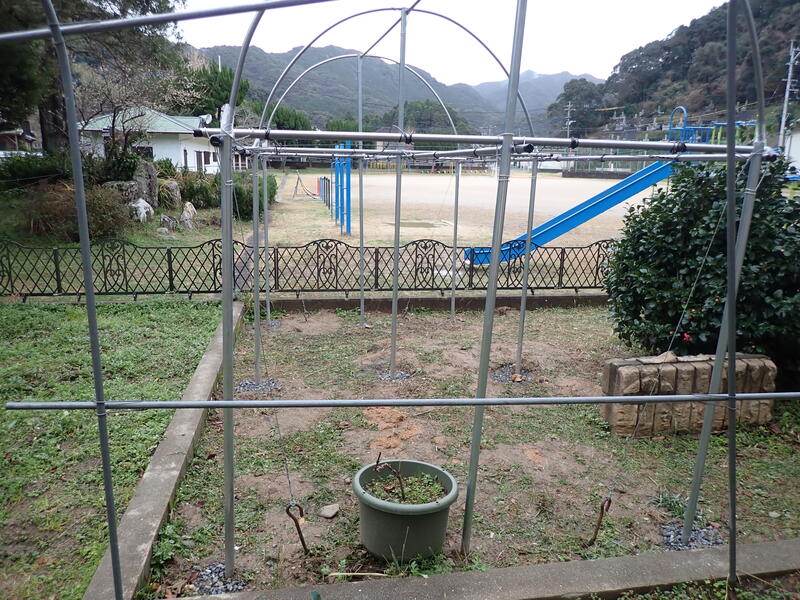 昨年度植えていたぶどうの木が根付いてきましたので、地域のぶどうの先生「宇土さん」に棚を作っていただきました。これからの成長が楽しみです。