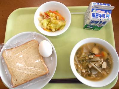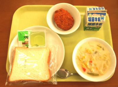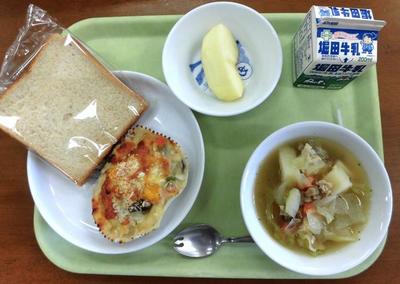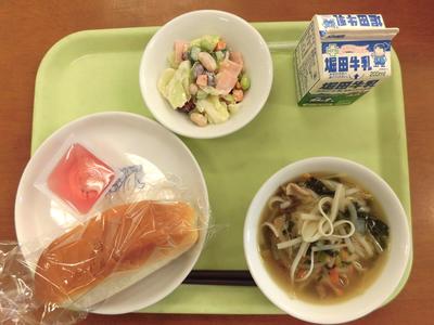 今日の給食は、ミルクパン・かぼちゃサラダ・ふわふわスープ・バナナでした。