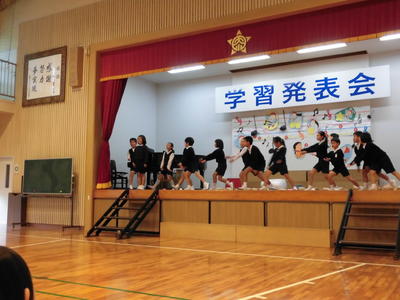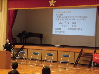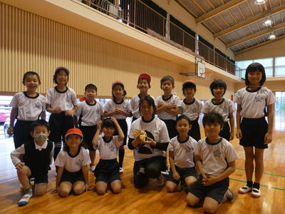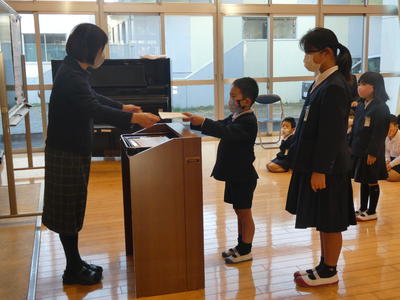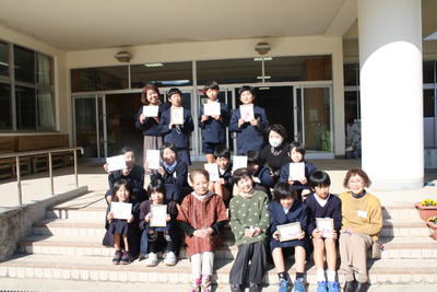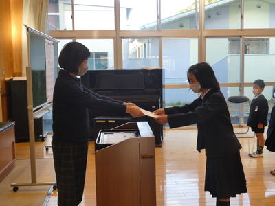 まずは漢字計算大会の表彰。努力賞、漢字満点賞、計算満点賞、ダブル満点賞の表彰がそれぞれありました。写真はダブル満点賞の女子。お見事!