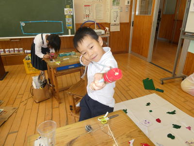 1年生が生活科で、秋のものを使った遊び道具を作りました。今日は松ぼっくりけん玉と松ぼっくりヨーヨーを作りました。