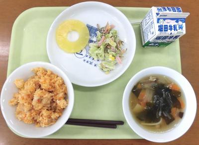 今日の給食は、麦ご飯・カボチャとベーコンの炒め物・魚そうめん汁・蓮根平つくねでした。
