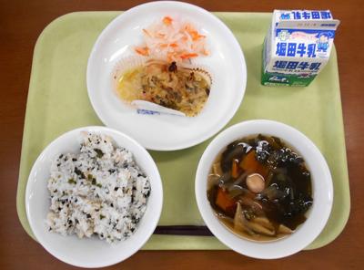 今日の給食のメニューは、ゆかりご飯、白玉団子汁、おろし人参の甘酢和え、きびなごフライでした。