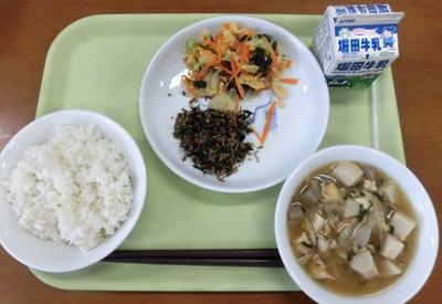 今日の給食<ひじきご飯・豆乳みそ汁・ぎょうざ・アーモンドあえ>