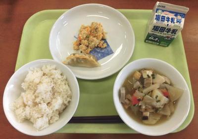 今日の給食のメニューは、麦ご飯、卯の花、根菜汁、ぎょうざでした。