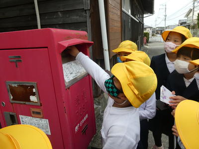 1年生が国語「てがみでしらせよう」でお手紙を書きました。おうちから便せんやはがきを持ってきて、誰にどんなことを書くかを考えて、そして宛名も住所も書いて(初めてだったので、混乱しました!)、切手も貼って、そして今日、学校前のポストに出しました。