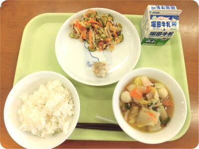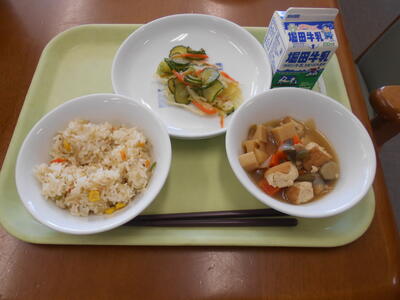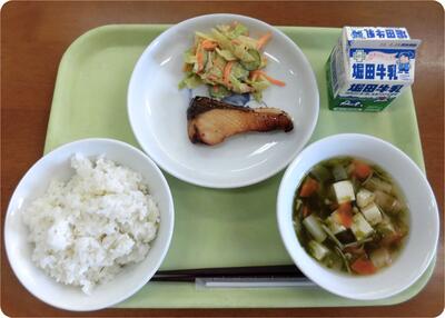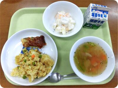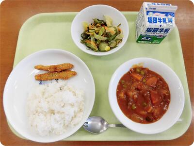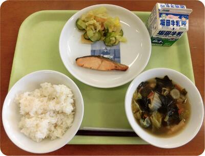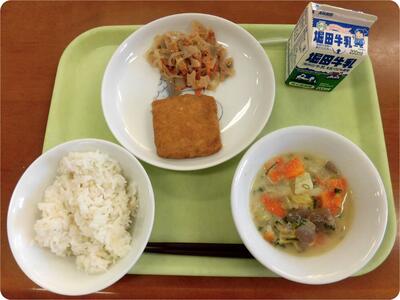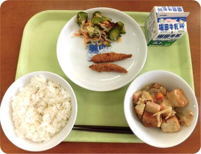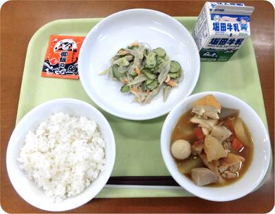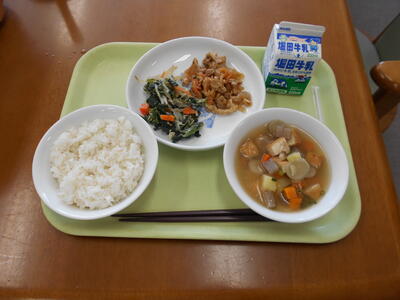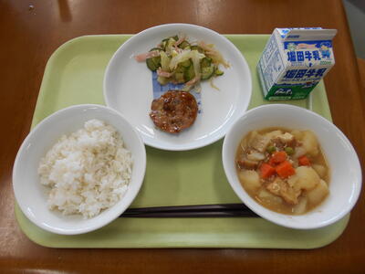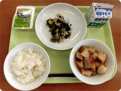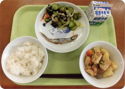 今日も、全部のメニューがおいしかったです。特に、新じゃがのそぼろ煮は、じゃがいもがほくほくとしていて、やわらかく抜群においしかったです。じゃがいもは、昔、ジャガタラ(今のジャカルタ)を通って入ってきたため、「ジャガタライモ」と呼ばれていたそうです。そこから「ジャガイモ」と呼ばれるようになった祖です。給食には、いろいろな野菜が使われていますが、どれも新鮮で食感がよく、とてもおいしいです。