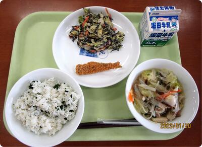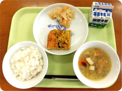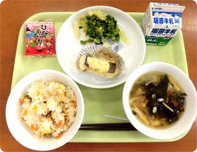 4月28日の献立は『麦ご飯、いわしのおかか煮、山菜和え』でした。春は、山菜がたくさん採れる時期で、いろいろな山菜が味わえます。今日の山菜和えには、ワラビやタケノコが入っていました。山の幸の「山菜」、海の幸の「いわし」、そして豚汁・・・。様々な食材が使われており、栄養のバランスもばっちりでした。今日もおいしい給食有り難うございました。