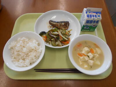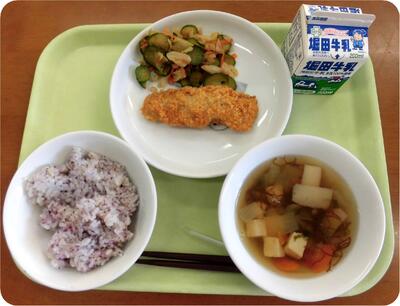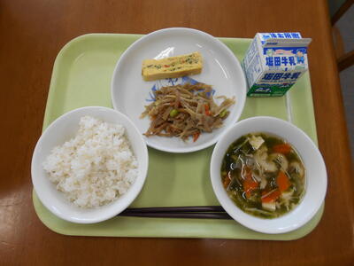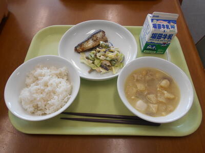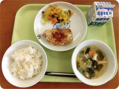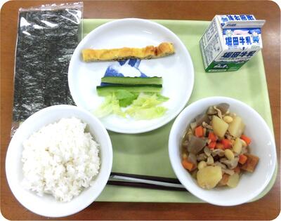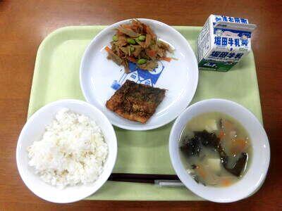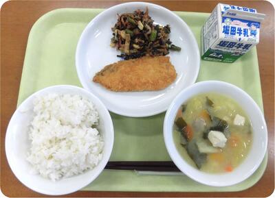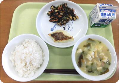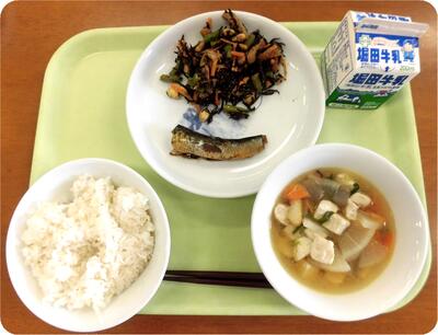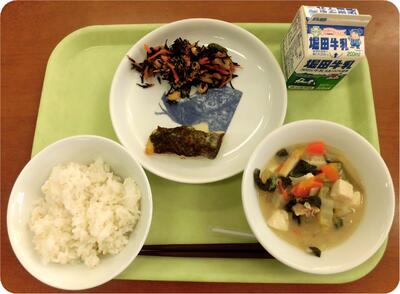 今日の給食のメニューは、麦ごはん、魚の煮付け、豚汁、ひじきの油炒めです。