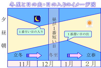 冬至といえばカボチャですね。理科教材園のカボチャもだいぶ大きくなってきました。ところで、今年は12月22日(水)に二十四節気「冬至」を迎えます。冬至は昼間の太陽が最も低く、一年の中で最も昼の時間が短くなる日です。しかし、昼の長さが最も短いからといって、冬至の日が日の入り時刻が最も早く、日の出時刻が最も遅くなるわけではありません。じつは、日の入りが最も早いのは冬至よりも前の時期で、ちょうど今頃が一年の中で最も日の入りが早い時期となります。そして、冬至に向けて日没は少しずつ遅くなっていきます。一方、日の出が最も遅くなるのは冬至よりも後の時期で、ちょうどお正月の頃にあたります。その中間頃に当たる冬至が、昼間の長さが(日の出から日の入りまで)が最も短い日なのです。(出典:ウェザーニュース)