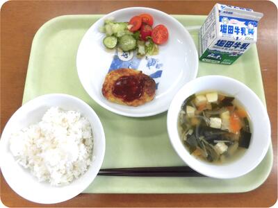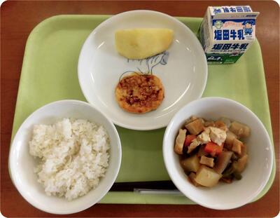 今日の給食のメニューは、麦ご飯、豆腐ハンバーグ、里芋の煮物、リンゴです。