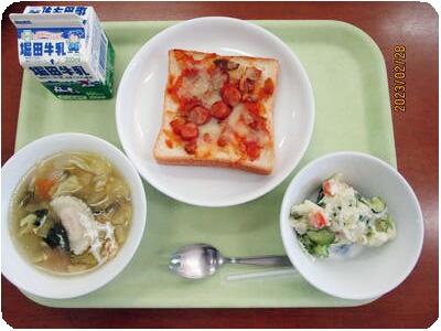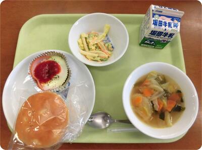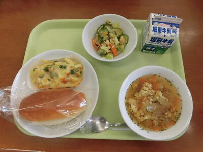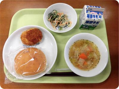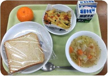 今日の給食のメニューは、ミルクパン、冬野菜のグラタン、ふわふわスープ、アーモンドサラダです。