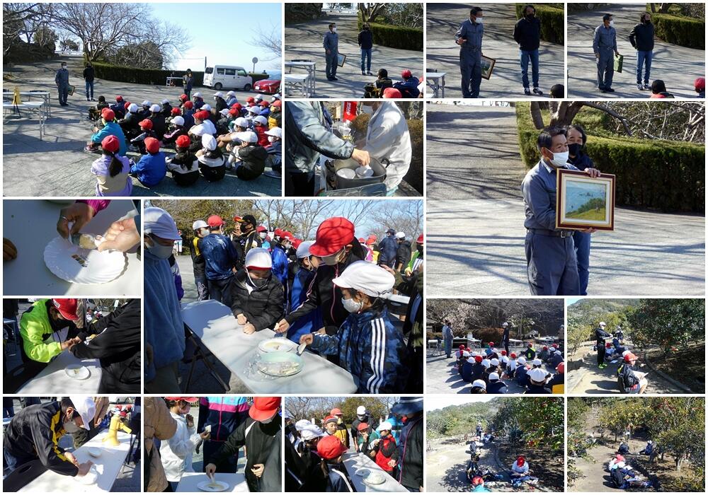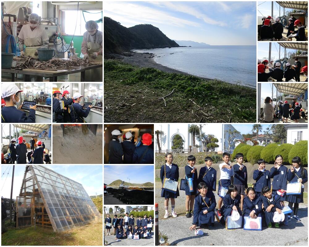5年生が大江見学に行きました。漁協では定置網のや加工場を見学させていただきました。保冷庫はなんとマイナス20℃だそうで、経験したことのない温度に震えました。次に天草でも早くから天然塩づくりをしておられる「天草塩の会」の塩屋を見学させていただきました。天日と釜炊きの二通りの製法で作っておられることが分かりました。味見をさせていただきましたが、しょっぱさのなかに天然塩特有のほのかな甘みと苦みがあることが分かりました。それから、大江教会やロザリオ館も見学させていただきました。教会や信仰の歴史が分かりました。天気もよく、抜けるような青空と白い教会のコントラストが素晴らしかったです。また、養豚業の方にもお話をお伺いすることができました。大切に育てられていることが分かりました。ご協力いただいた大江漁協の皆さん、天草塩の会の皆さん、大江教会の皆さん、ロザリオ館の皆さん、養豚業の皆さん、ご多用にもかかわらず、見学させていただきありがとうございました。おかげで大江の産業・歴史・文化・伝統を学ぶことができました。