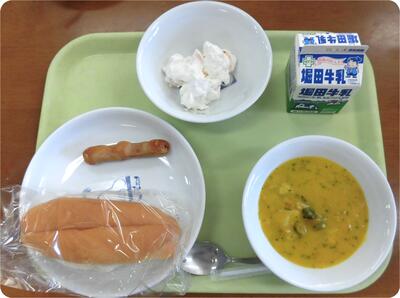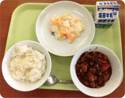今日の給食のメニューは、麦ご飯、カレー、フルーツヨーグルトです。