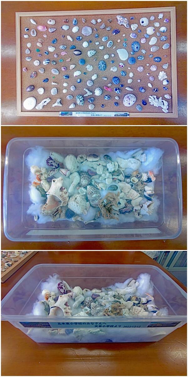 歌をお聴かせした後、五木東小の校長先生には、6年生が天草町大江の須賀無田海岸で集めた貝をプレゼントしました。海の香りが五木東小学校に届くといいなと思います。