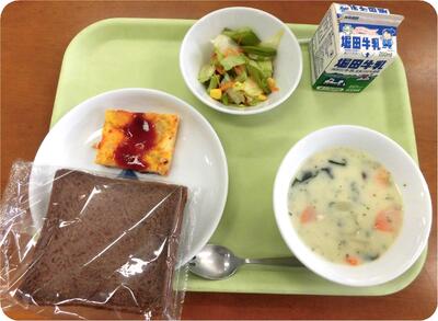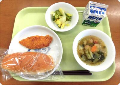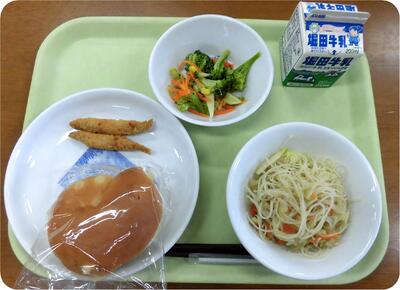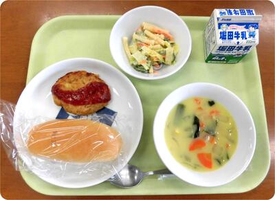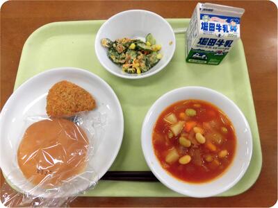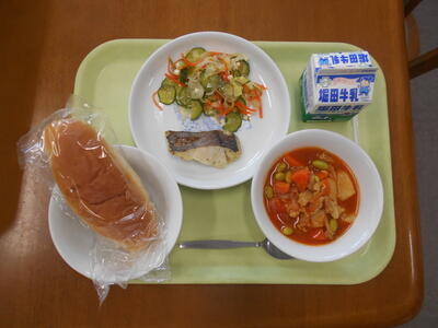 4月25日の献立は、『ミルクパン、ポークビーンズ、魚のバジルオリーブやき、イタリアンサラダ』でした。「畑のお肉」と言われる栄養満点の大豆が、たっぷり入ったポークビーンズは、ミルクパンとの相性もぴったりでとてもおいしいかったです。ほんのりバジルの香りのするやき魚、シャキシャキ野菜のイタリアンサラダとの組み合わせもとてもバランスがよく、今日もおいしくいただくことができました。