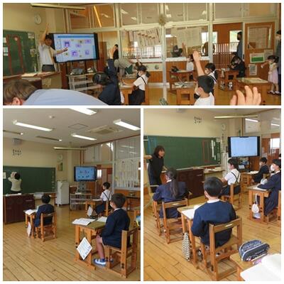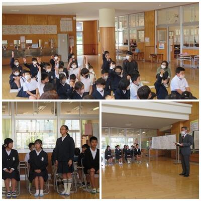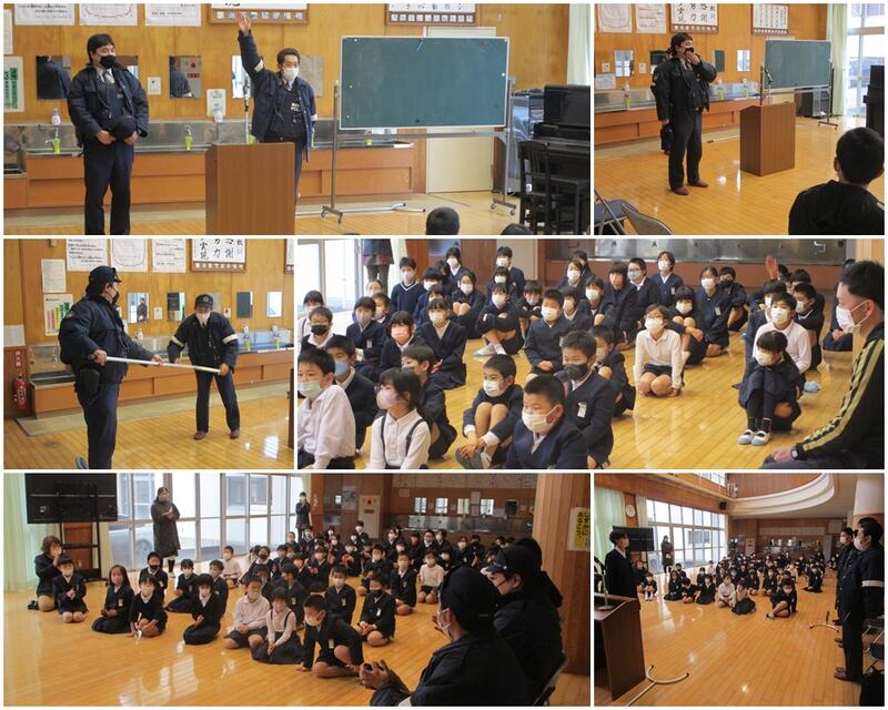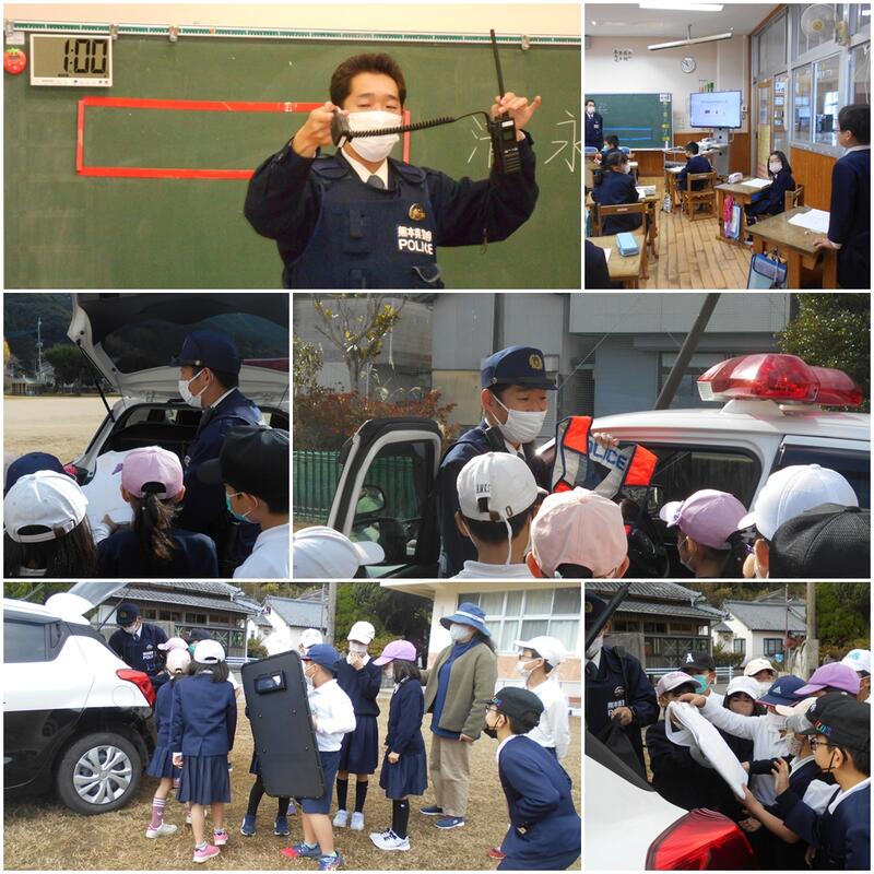 いつも登下校時の見守りなどして頂いている大江派出所の清永巡査部長においで頂き、警察の仕事について教えて頂きました。無線機や防御盾なども見せて頂いたり、パトカーも見せて頂いたりして子供たちは警察の仕事に対する興味関心を深めることができました。清永巡査部長、公務ご多用にもかかわらず、子供たちのためにおいで頂き、ありがとうございました。