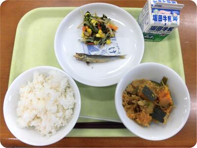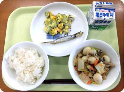 今日の給食のメニューは、麦ご飯、焼きシシャモ、八宝菜、かぼちゃサラダです。