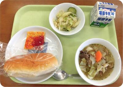 今日の給食のメニューは、ミルクパン、トマトオムレツ、ポトフ、レタスサラダです。