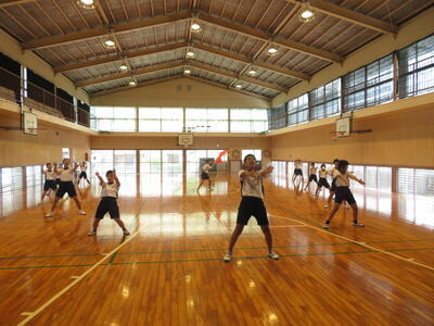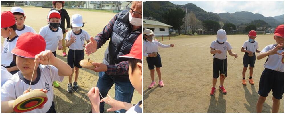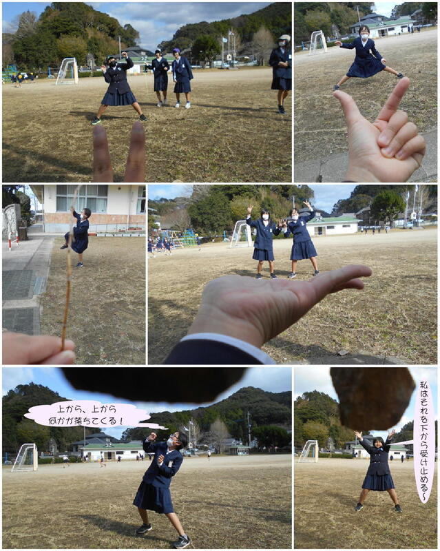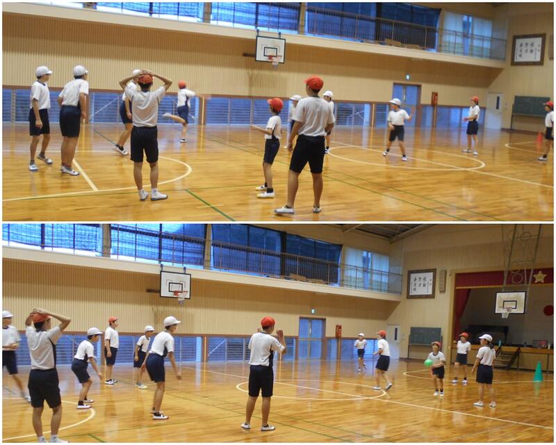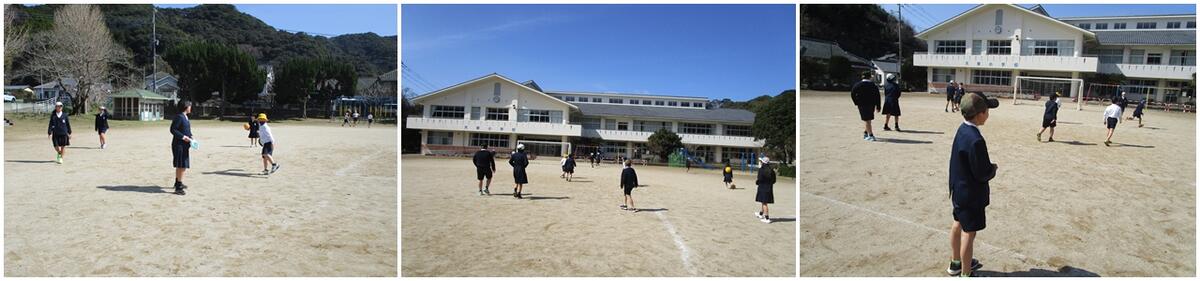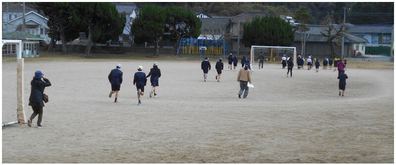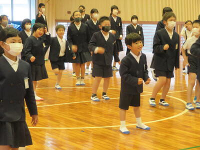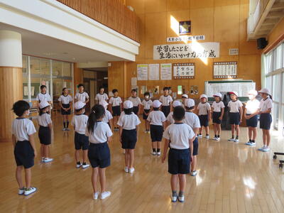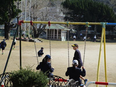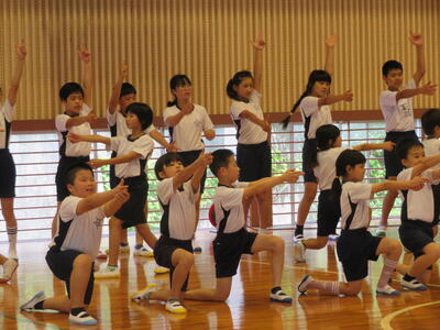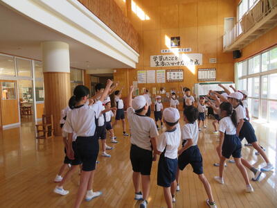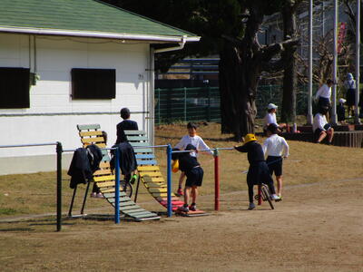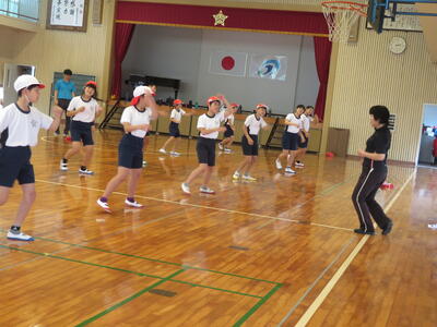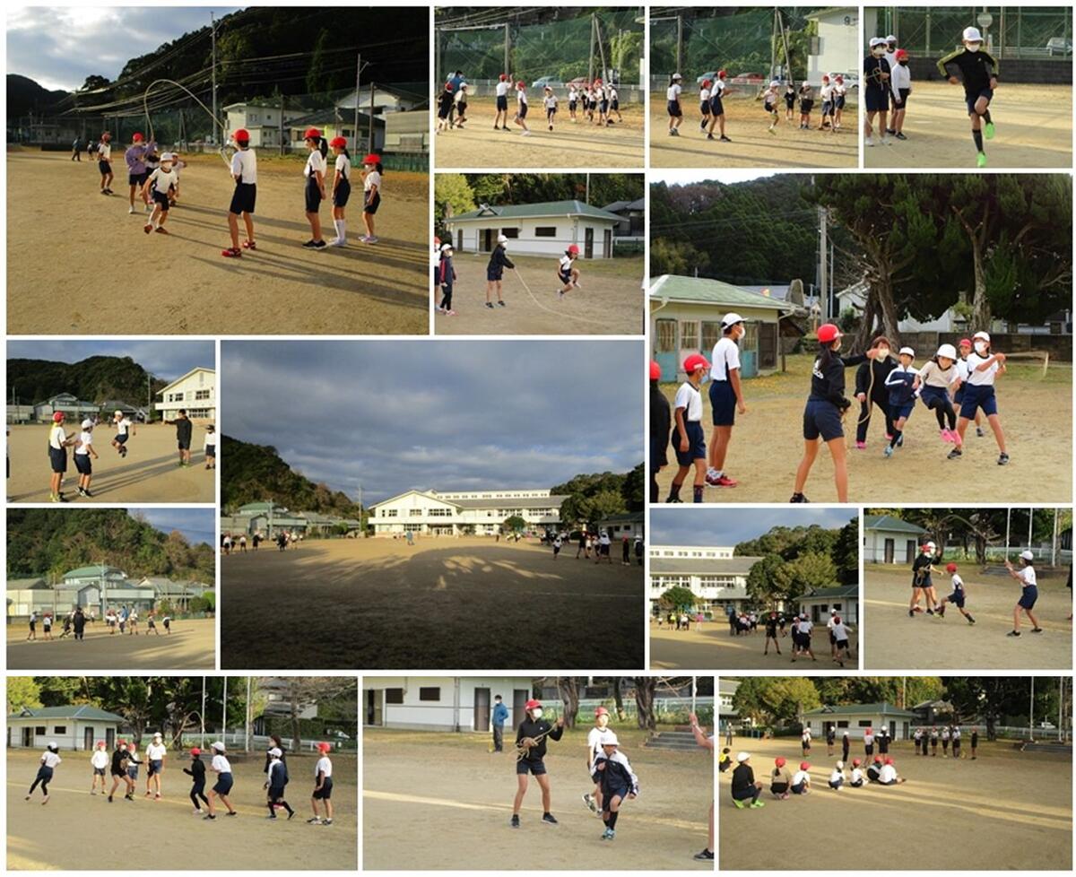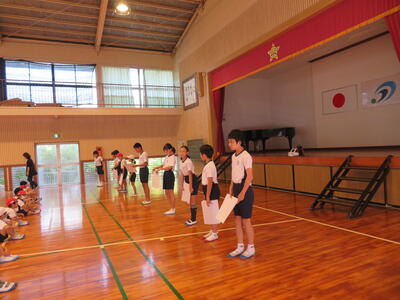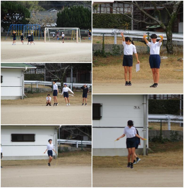 朝の体力づくりの時間に縦割り班で長縄跳びをしています。低学年の子供たちのなかには、跳ぶタイミングがなかなかつかめない人もいます。そんなときは高学年の人たちが優しく背中を押して入るタイミングを教えてくれています。よい伝統が続いています。