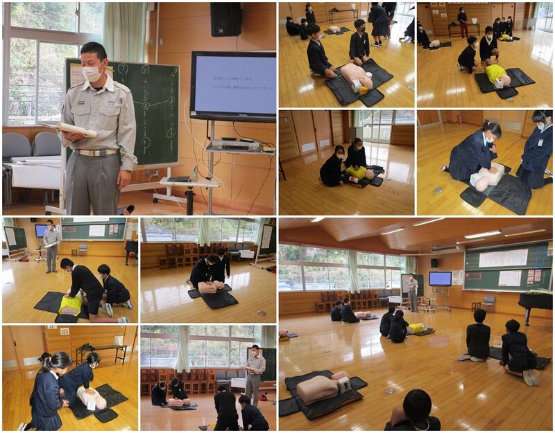 本日、南消防署西天草分署から山下さんにおいで頂き、5年生の「けがの手当」について講話や実技指導をして頂きました。心肺蘇生法の講習では、5体の心肺蘇生訓練用人形を持ってきて頂いたので、12名の子供たちは充分蘇生法の練習をすることができました。また、「担任が倒れた」という想定で通報訓練も上手に行うことができました。山下さん、ありがとうございました。