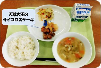 今日の給食のメニューは、麦ご飯、天草大王のサイコロステーキ、お手製すいとん汁、白菜漬けです。