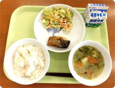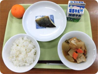 今日の給食のメニューは、麦ご飯、魚の塩焼き、大根のべっこう煮、みかんです。