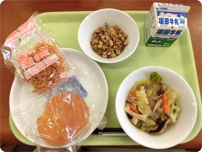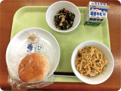 今日の給食のメニューは、丸パン、シューマイ、焼きそば、ひじきサラダです。