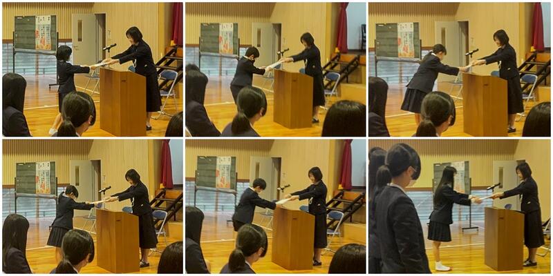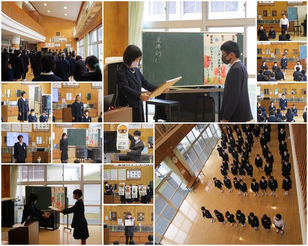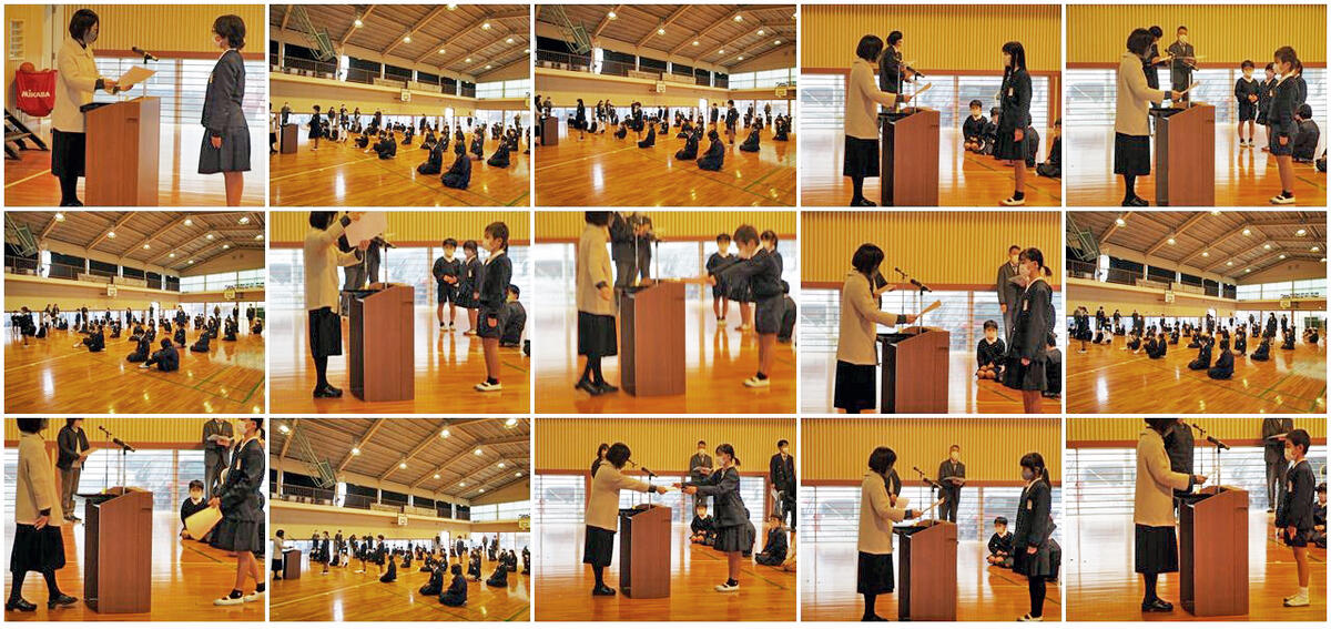 今日は表彰がありました。郡市文化展(毛硬筆・描画・壁新聞)、科学発明展、天草南こどもアート展(毛硬筆・描画)、校内漢字計算大会の表彰がありました。たくさんの人が表彰され、みんなよく頑張った2学期でした。