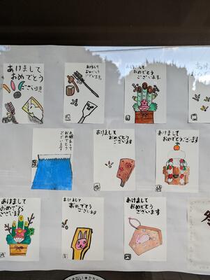 5年生が絵手紙の年賀状を一生懸命描いていましたので紹介します。みんな集中して黙々と取り組んでいました。