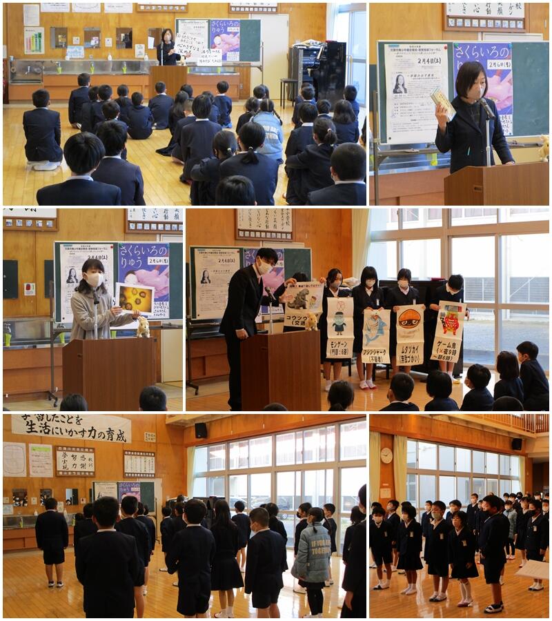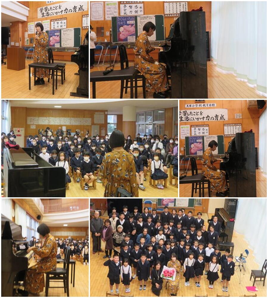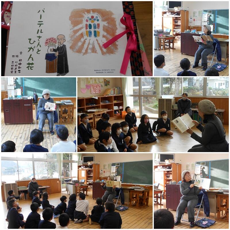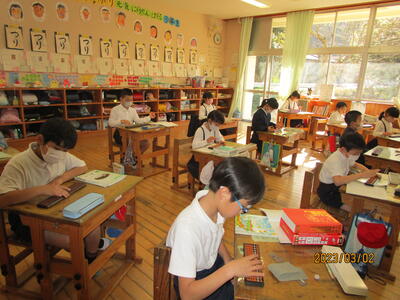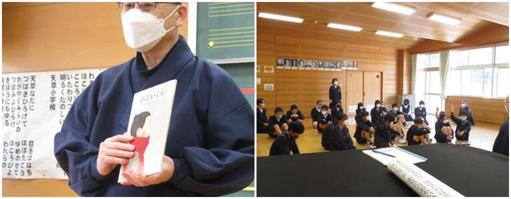 本日、五木東小学校の校長先生と、熊本市立碩台小学校の校長先生が学校視察においでになりました。全校児童が、ウェルカムソングとして「福連木の子守唄」を唄いました。五木東小とは、福連木の子守唄と五木の子守歌のつながりで交流が始まって5年がたちました。5年前は夏休みに天草小学校が五木村に出かけ、4年前は五木村から天草町に来ていただきました。それから、コロナ渦となり、直接交流ができなくなりましたが、リモート交流を続けています。碩台小学校の校長先生は、熊本県小学校教育研究会音楽部会の会長を務めておられ、来年度の同部会が発行する「音楽ノート」にQRコードをつけ、本日録音されたものが聞けるようにしたいとのことでした。統合前の旧高浜小に勤務をされておられたとのことで懐かしがっておられました。