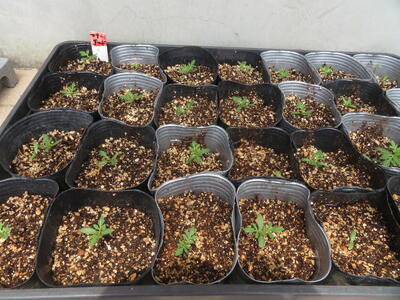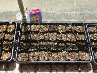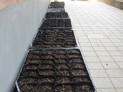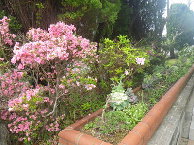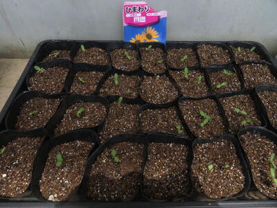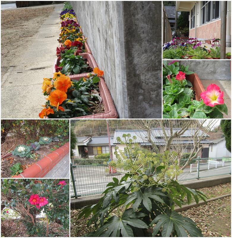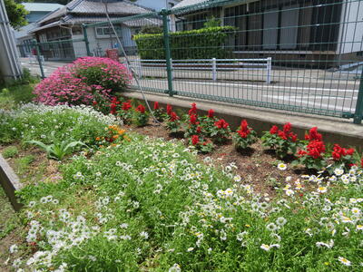 五月晴れの今日、天草小学校の花も美しく咲いています。それからお花の種から芽を出し、たくさんの苗も育っています。(運動会練習)