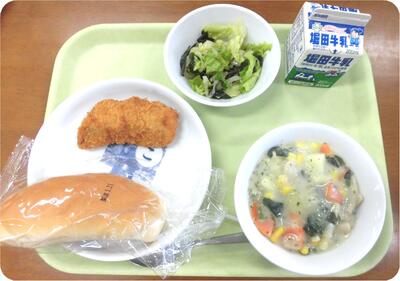 今日の給食のメニューは、丸パン、冬野菜のシチュー、白身魚フライ、ビーンズサラダです。