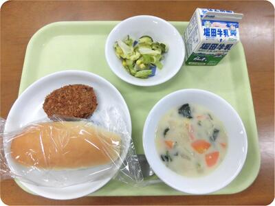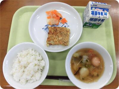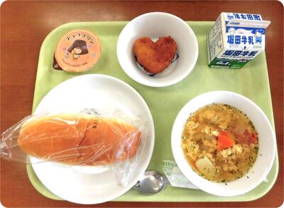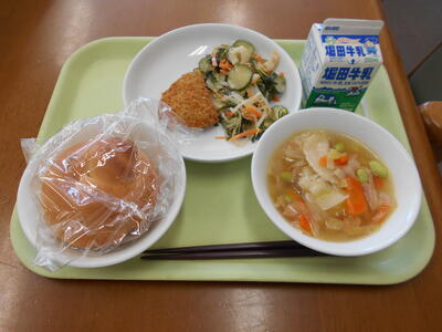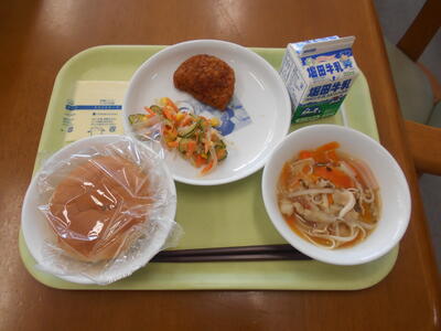 4月27日の献立は『まるパン、コンソメスープ、コロッケ、にんじんサラダ』でした。栄養士さんの「給食の話」の中に「食べ物は、体の栄養だけでなく、心の栄養になる。」という言葉がありました。見た目、音、匂い、味、食感など五感を使っておいしい給食を食べることで、心の栄養になるんですね。調理員の皆さんが一つ一つ心を込めて作って下さったコロッケがとてもおいしかったです