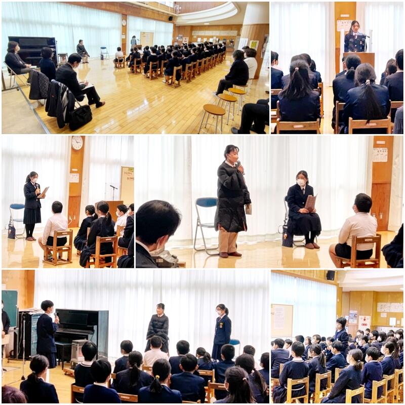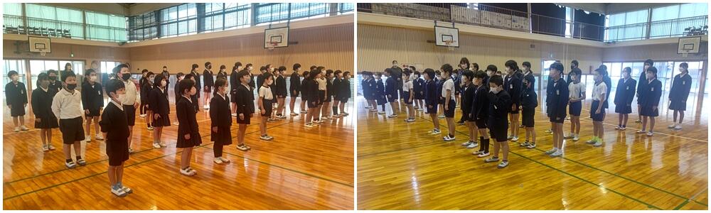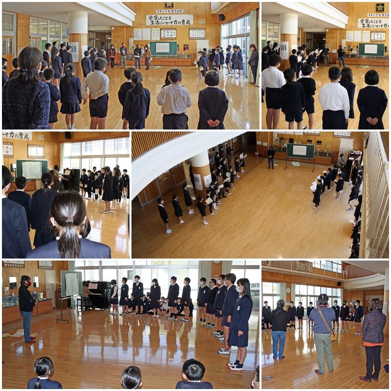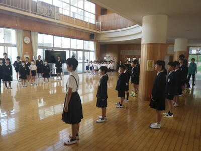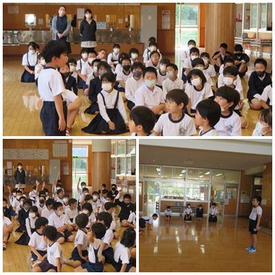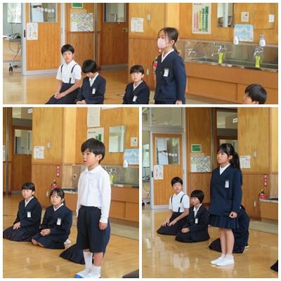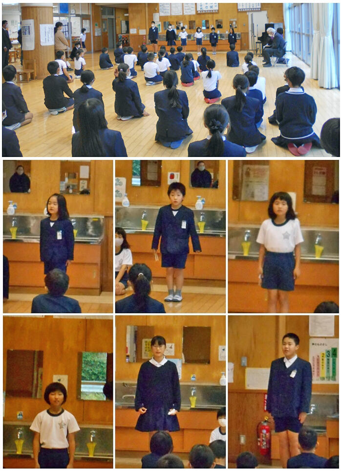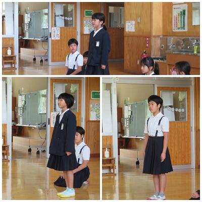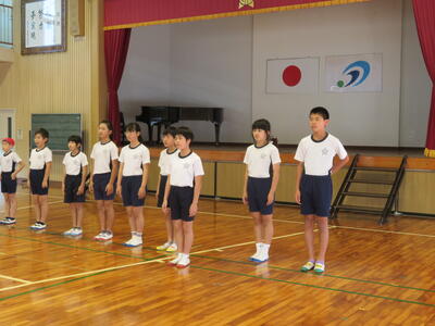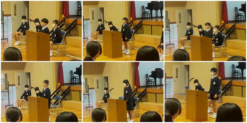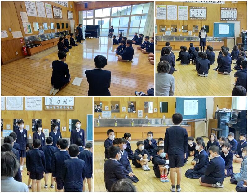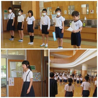 今月の月目標の反省を各学年の代表が発表しました。今月は「気持ちのよいあいさつをしよう」です。一人一人の自覚が高まり、特に朝のあいさつは声も心も響き合っています。