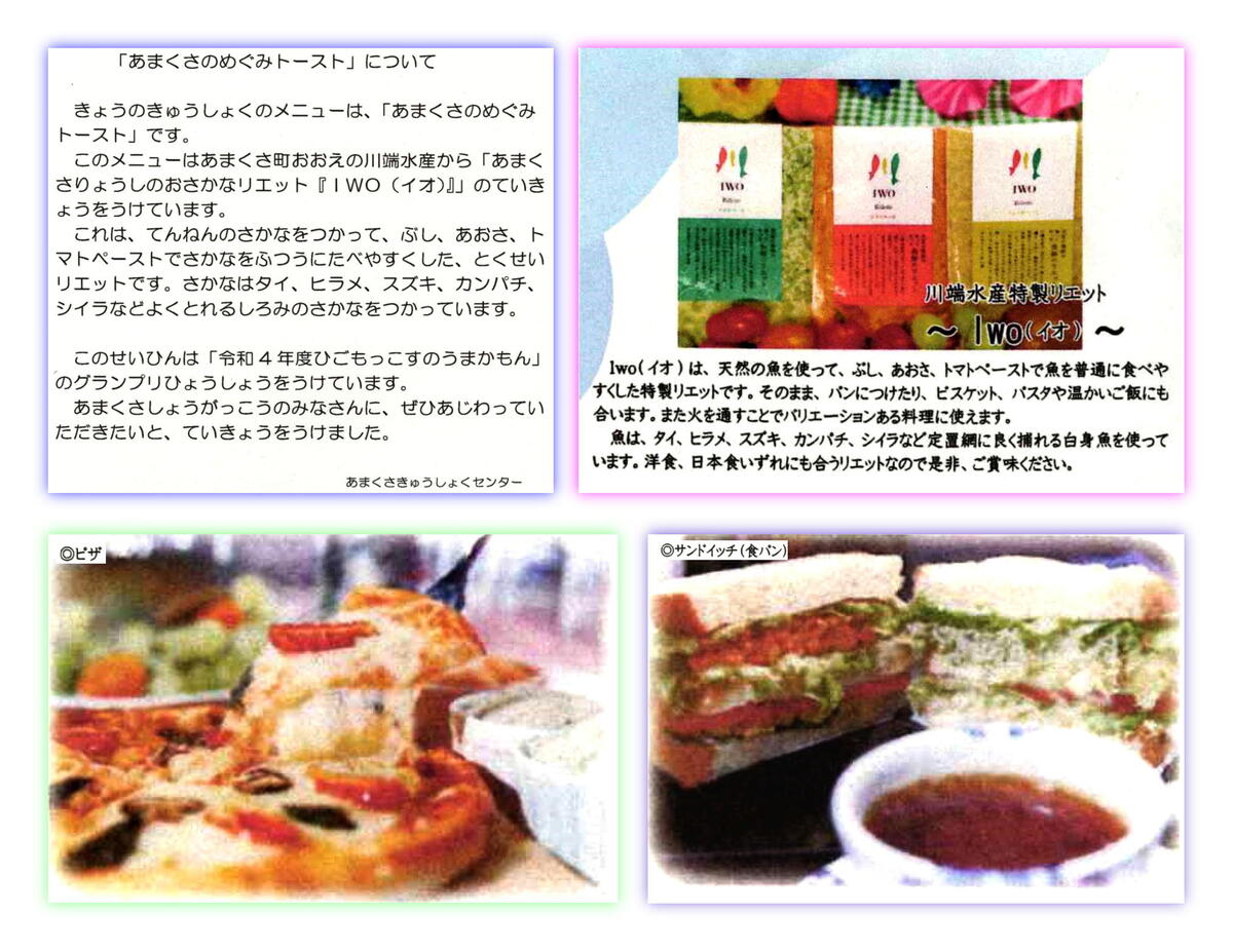 5月2日の献立は『ミルクパン、野菜スープ、きびなごフライ、アスパラサラダ、かしわ餅』でした。5月5日「端午の節句」にちなんだ「かしわ餅」には親から子へと命がつながることを願って食べているそうです。日本人は、様々な思いを込めて食文化を受け継いできたことがわかりますね。こんなよき伝統・文化を大切にしていきたいですね。また、天草の名物と言ってもいい「きびなご」、今日は、フライでしたが、さしみ、吸い物、焼きもの・・・、いろいろな食べ方がありますが、どれもおいしい魚ですね。みなさんはどんな食べ方が好きですか?