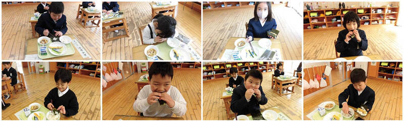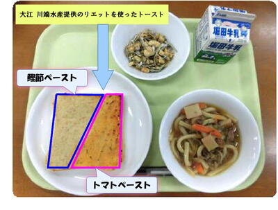 「じゃがいものみそ汁」は、大江でとれた新じゃがが使われています。大江地域づくり振興会からの提供です。やわらかくて最高に美味しいジャガイモでした。「いわしのおかかに」は、ご飯のおかずにぴったりです。子供たちも満足そうにいただいていました。