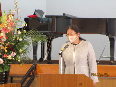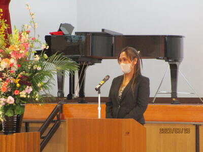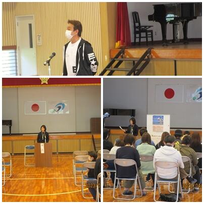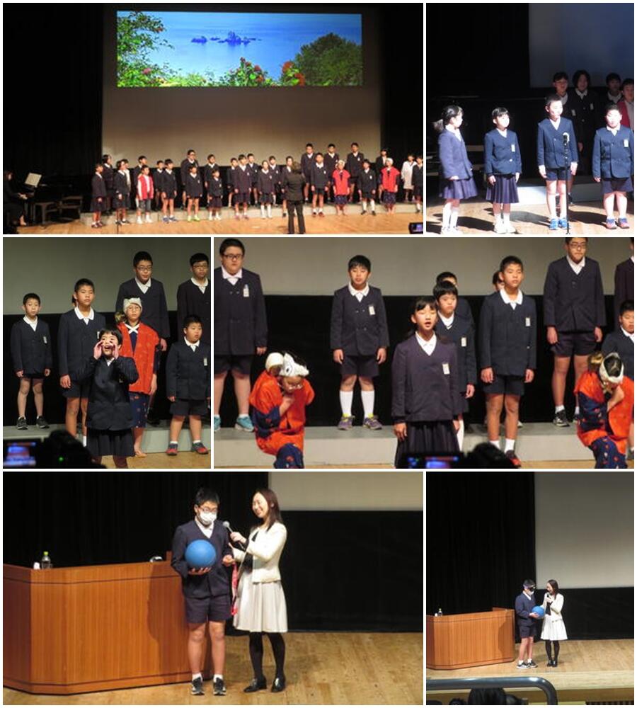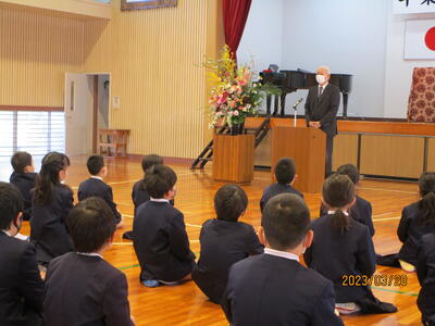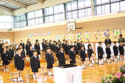 さて、今年みなさんに三つの頑張って欲しいことを話します。まず一つ目は、毎時間の授業を頑張るです。よく考えてよく発表しましょう。学習リーダーさんには、どんどん活躍してもらえたらなと思っています。二つ目は、積み重なった伝統をより輝かせていきましょう。合唱、描画、毛筆、硬筆、など、より美しいものを求めていきましょう。体力づくりも大切です。それぞれの目標を立てて頑張りましょう。外でたくさん遊んで体力をつけて欲しいです。そして、教室の中では明るい歌声を響かせてください。合唱はなかまづくりです。三つ目は、天草体験学習研究発表をはじめ、発表の場が多くなります。ひとつ一つ発表の場を頑張ることで、自分たちの成長につなげましょう。