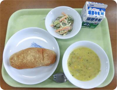 5月9日の献立は『ひのくにぱん、ラビオリスープ、かぼちゃフライ、ちくわとやさいのごまサラダ』でした。大型連休のため、いろんなところへ出かけ、おいしい物をたくさん食べられたのではないでしょうか。しかし、好きな物ばかり食べてしまい栄養が偏りすぎてしまった人も多かったのでは・・・?学校が始まって給食を食べると、やっぱり栄養のバランスのとれた食事の大切さを感じました。今日も栄養バランスばっちりの給食に感謝です。