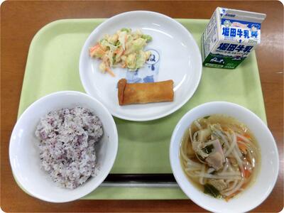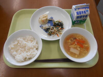 4月25日の献立は『麦ご飯、中華風たまごスープ、お豆腐しゅうまい、ほうれん草のささみ和え』でした。
