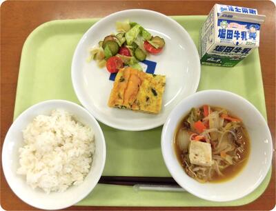 今日の給食のメニューは、麦ご飯、五目卵焼き、キムチのピリ辛味噌汁、柿なますです。