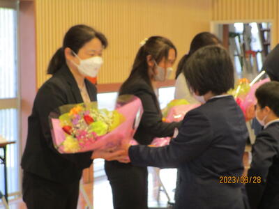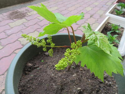 卒業式の日に、卒業生と学校に高浜ぶどうの会からいただいたブドウの木の苗が育ち、花をつけました。