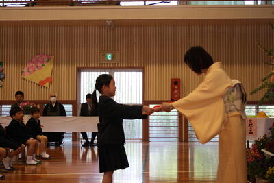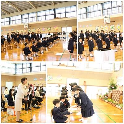 今日は入学式がありました。11名の新1年生が堂々と体育館に入場し、長尾先生の氏名報告にも大きな声で返事をしました。校長先生や教育委員会、来賓の方のお祝いの言葉、2年生の歓迎の言葉もしっかりと聞いていました。その後、教科書を校長先生に手渡してもらい、うれしそうな表情でした。